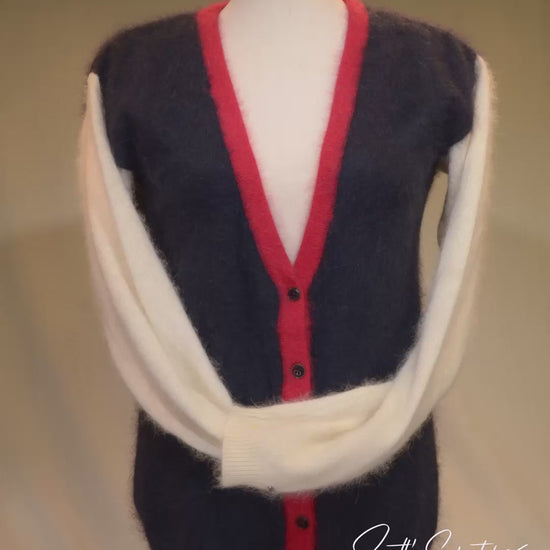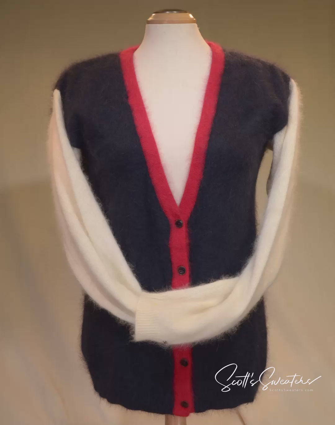 トミー ヒルフィガーの、白い袖と開口部の周りの赤いトリムが付いた美しいネイビー ブルーのアンゴラ カーディガン セーター。
