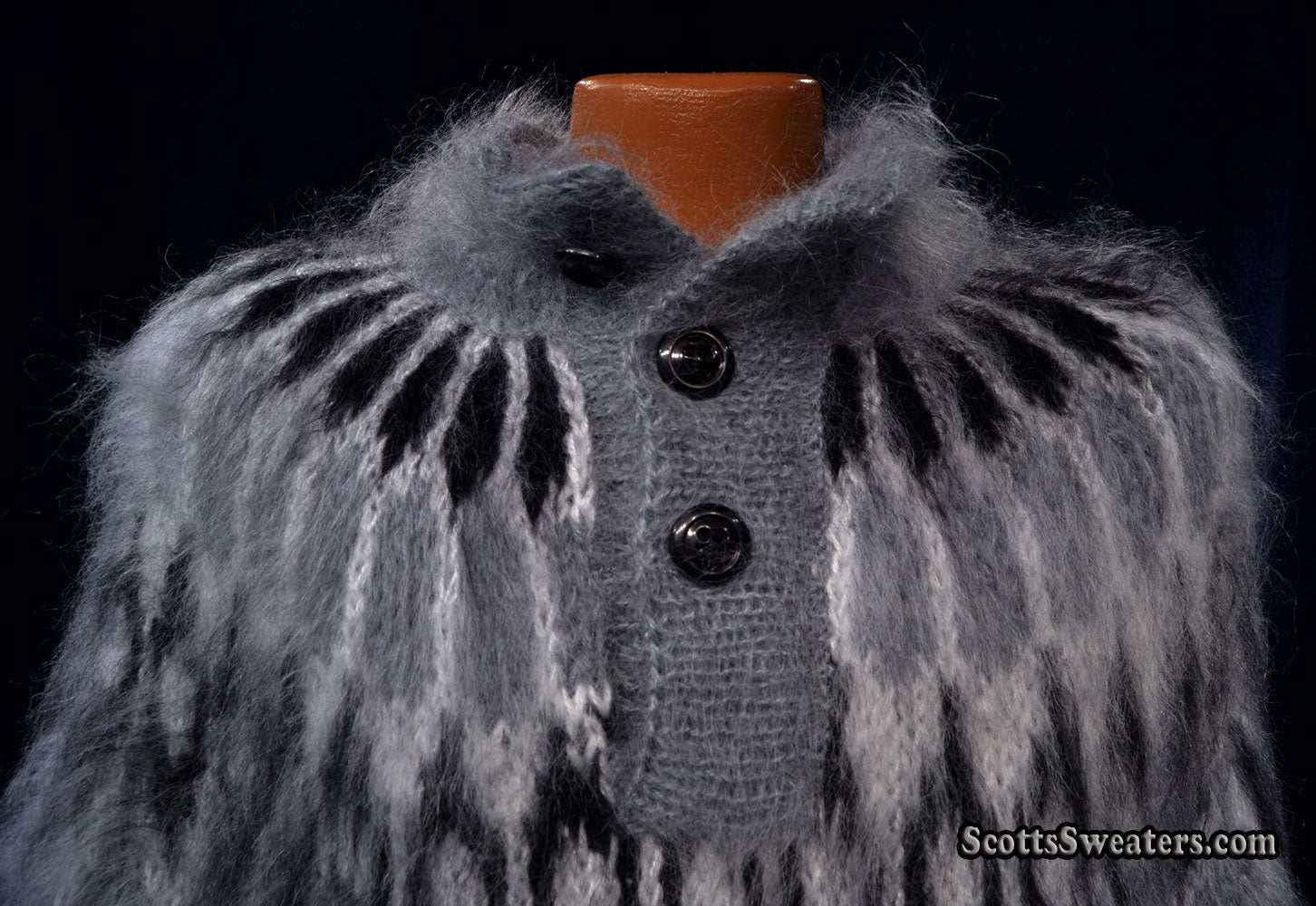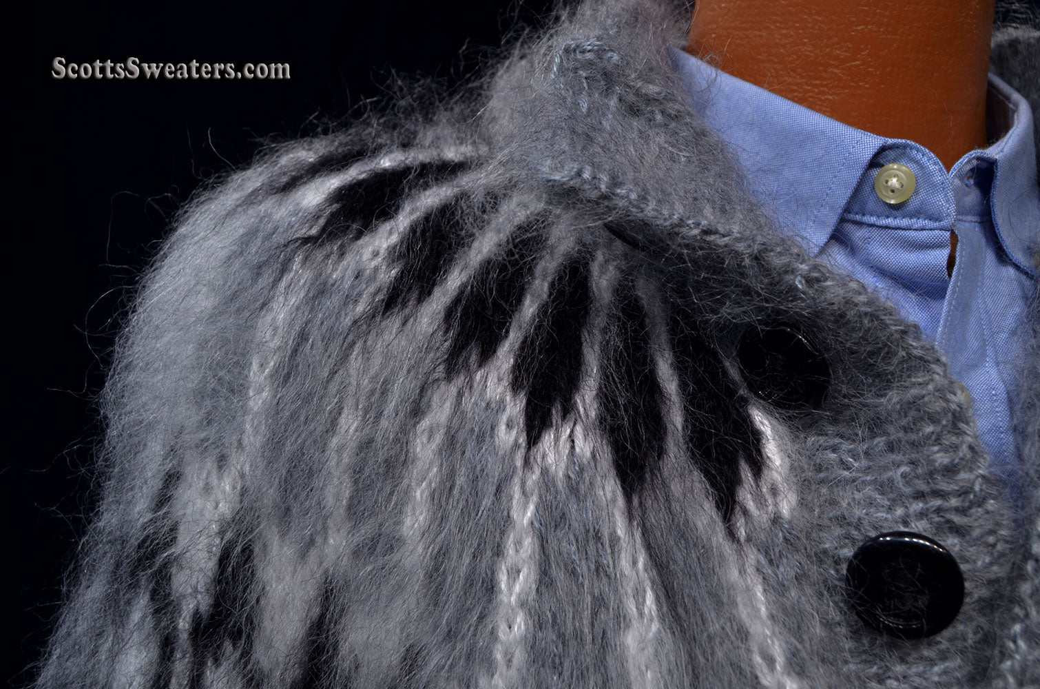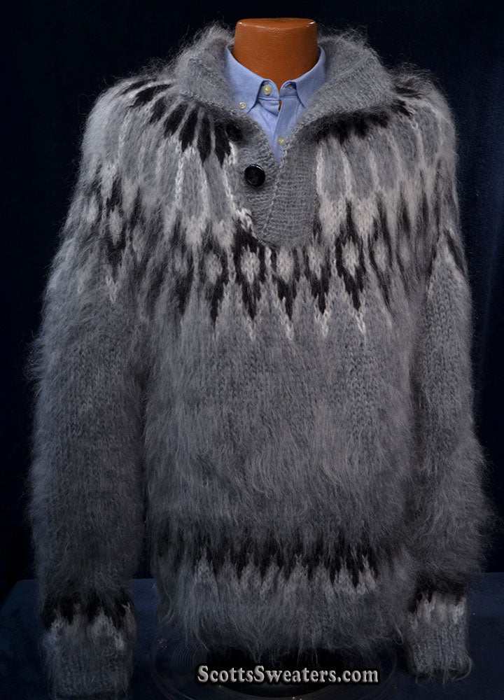 Hand-knit men's pullover mohair sweater with a Henley style three-button neck design in size X-Large.