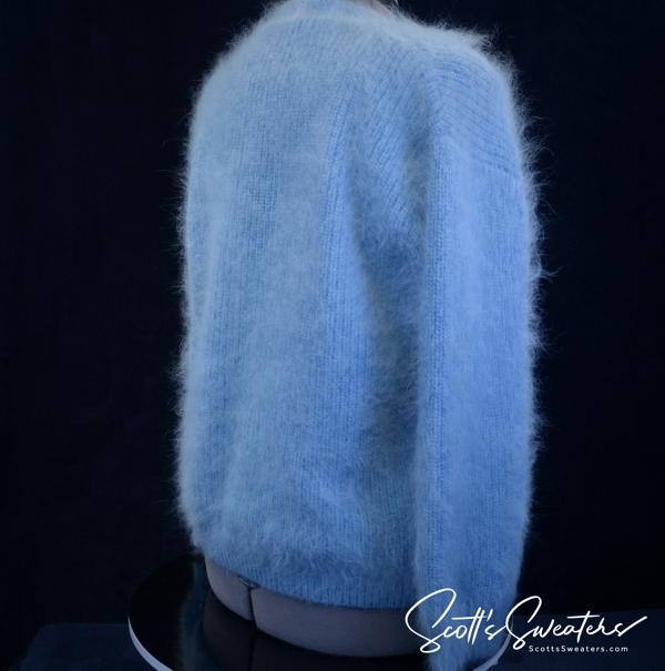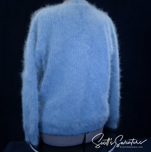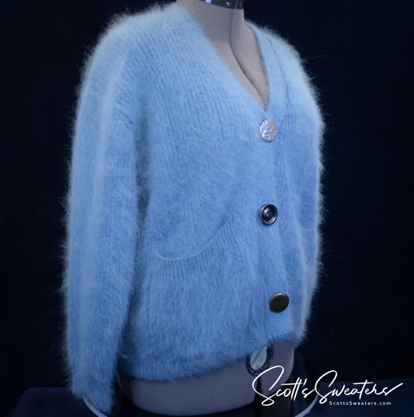 Powder-blue angora sweater cardigan with three oversized metal buttons & front pockets