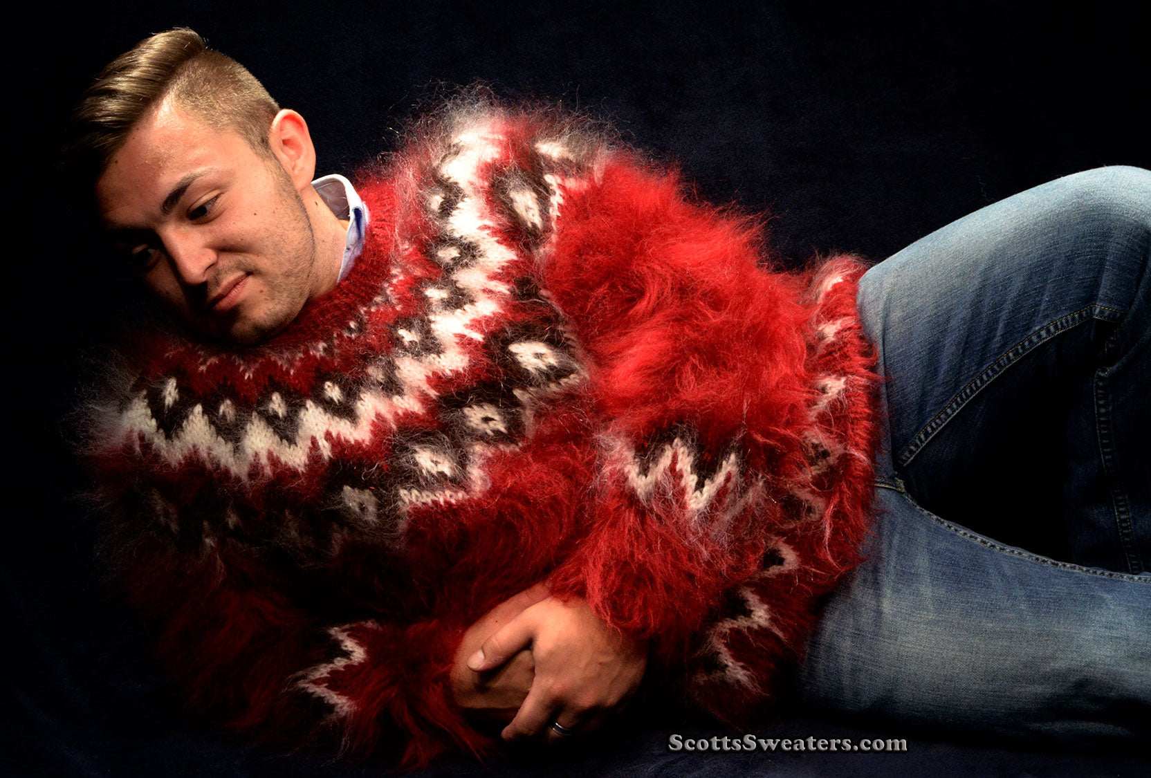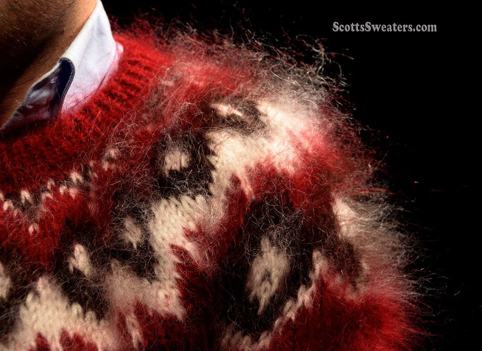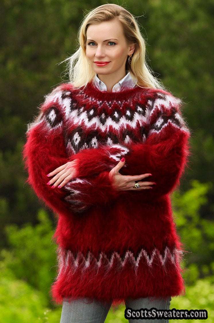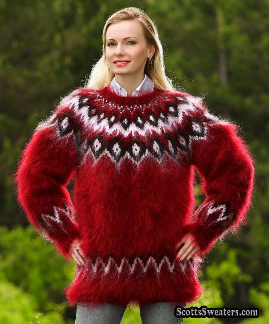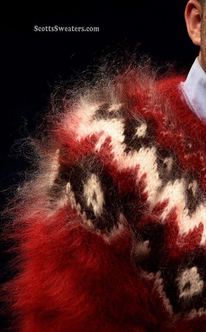Unisex hand-knit crewneck mohair sweater in deep red with white/black yoke pattern.