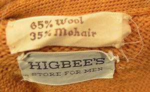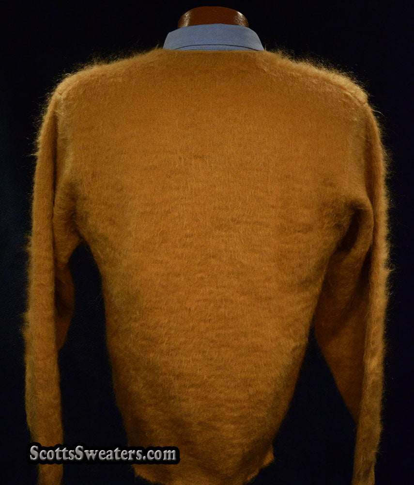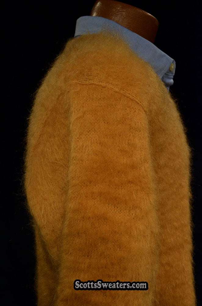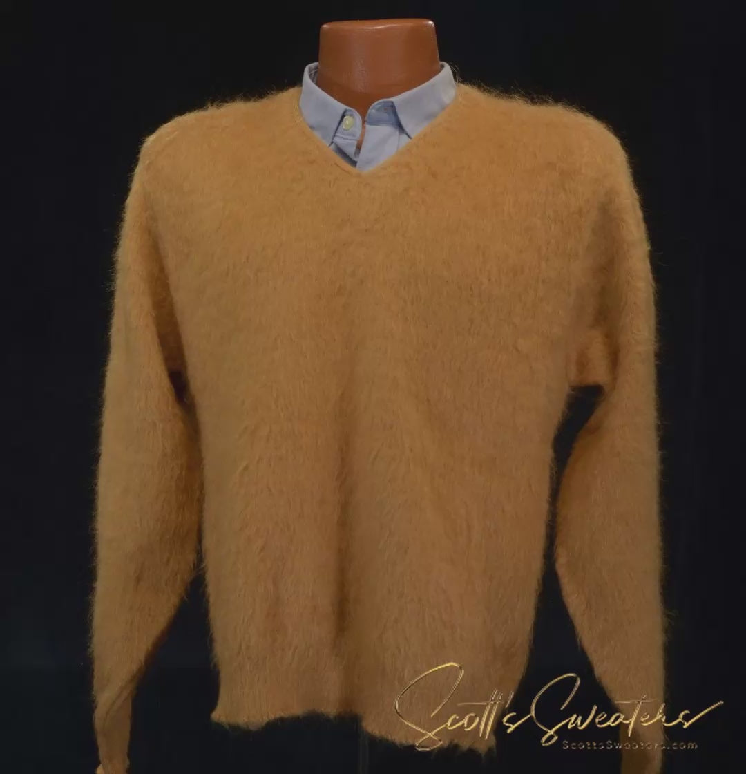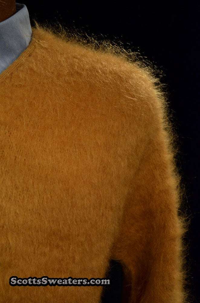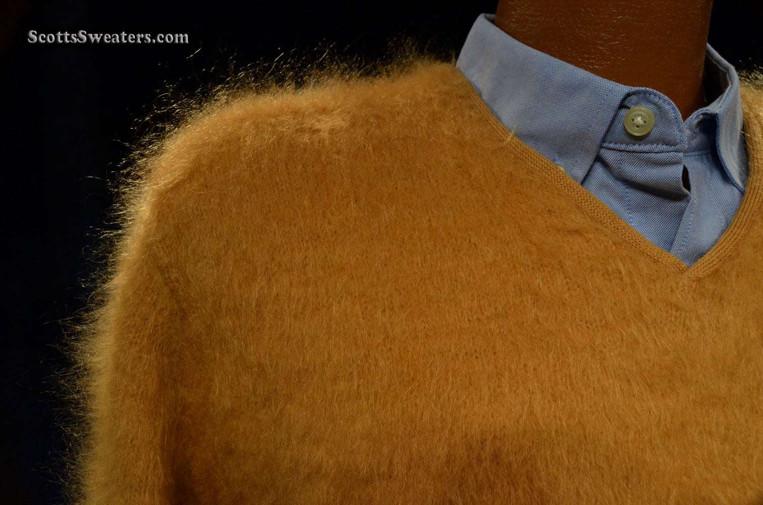 Golden retro fuzzy V-neck brushed mohair sweater by Higbee's Store for Men
