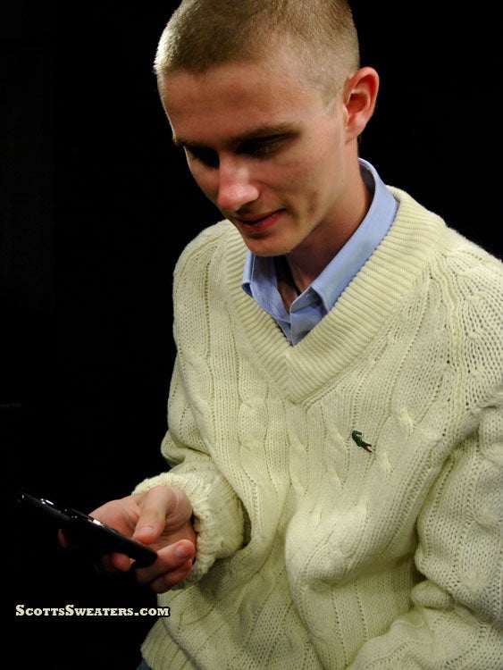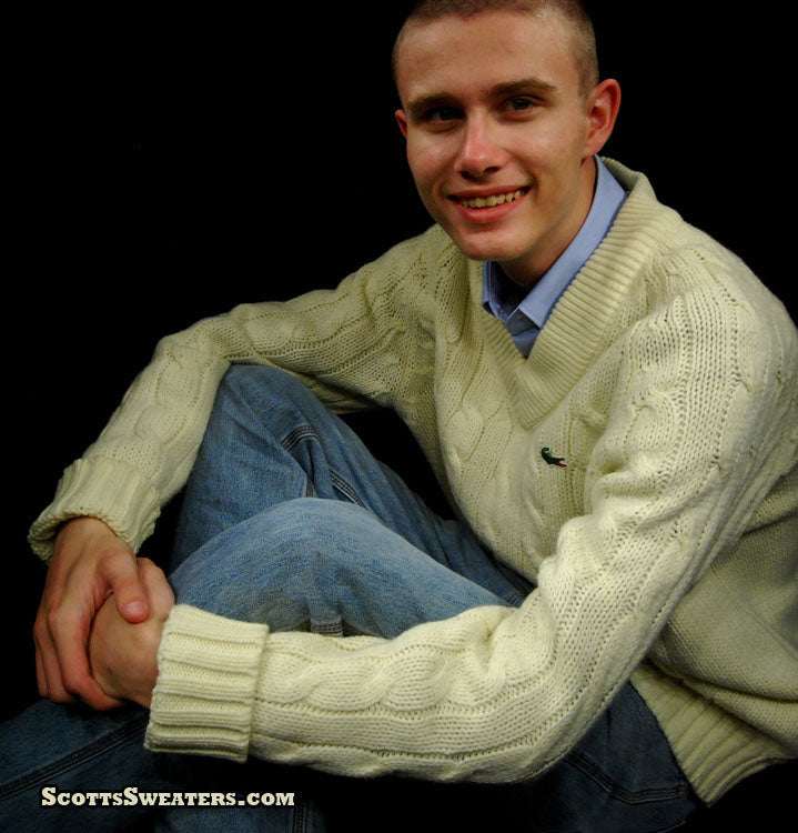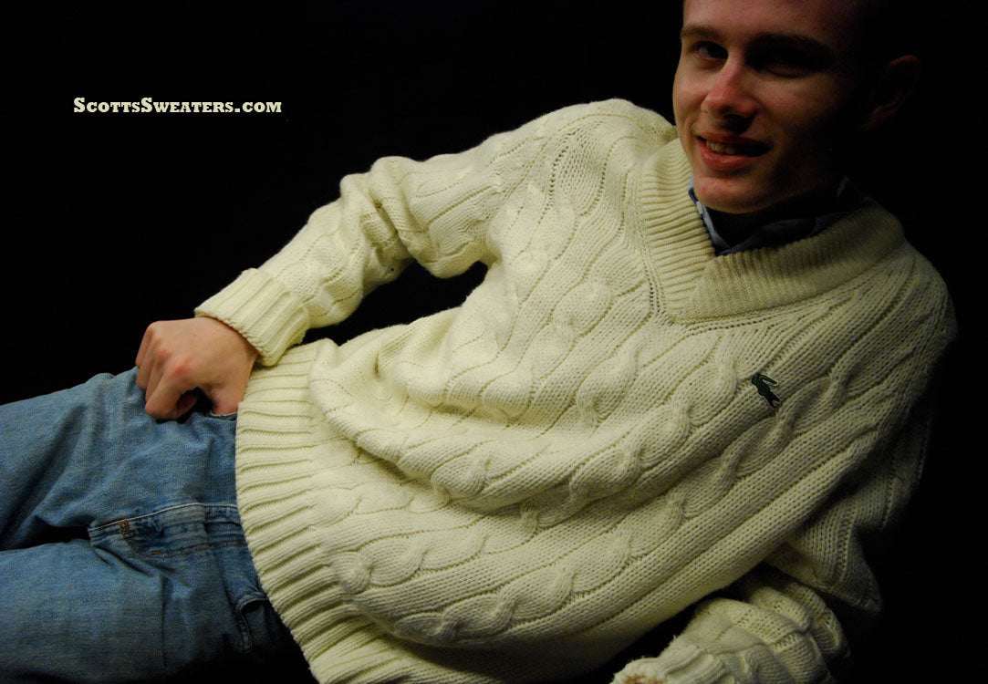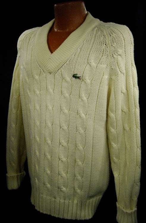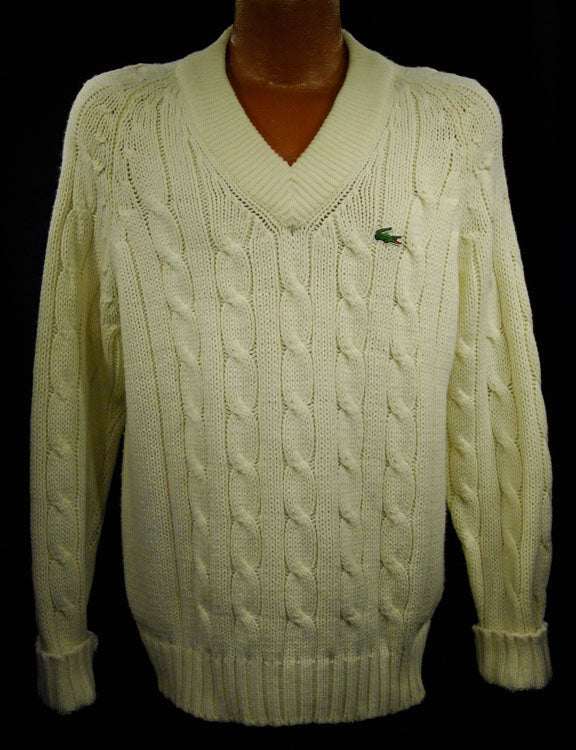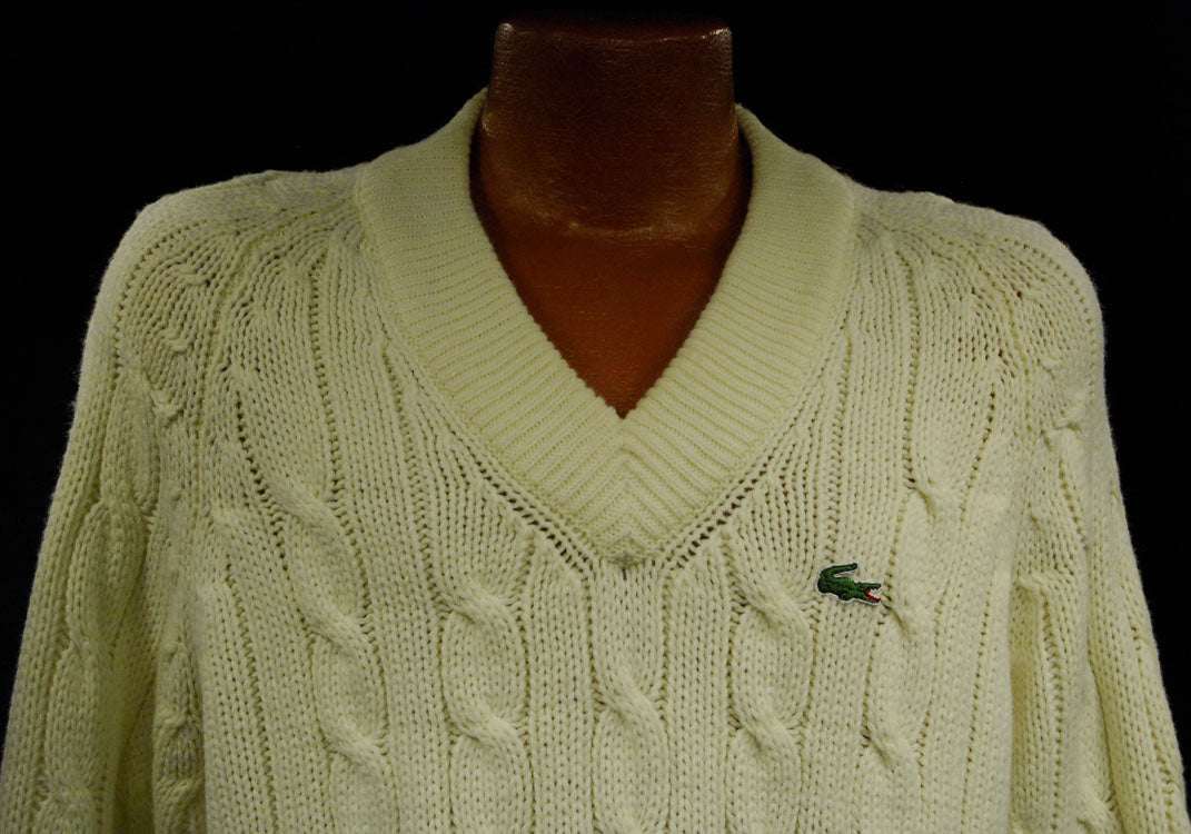 Original Izod Lacoste solid ivory color cable-knit classic retro crocodile tennis / cricket sweaters.