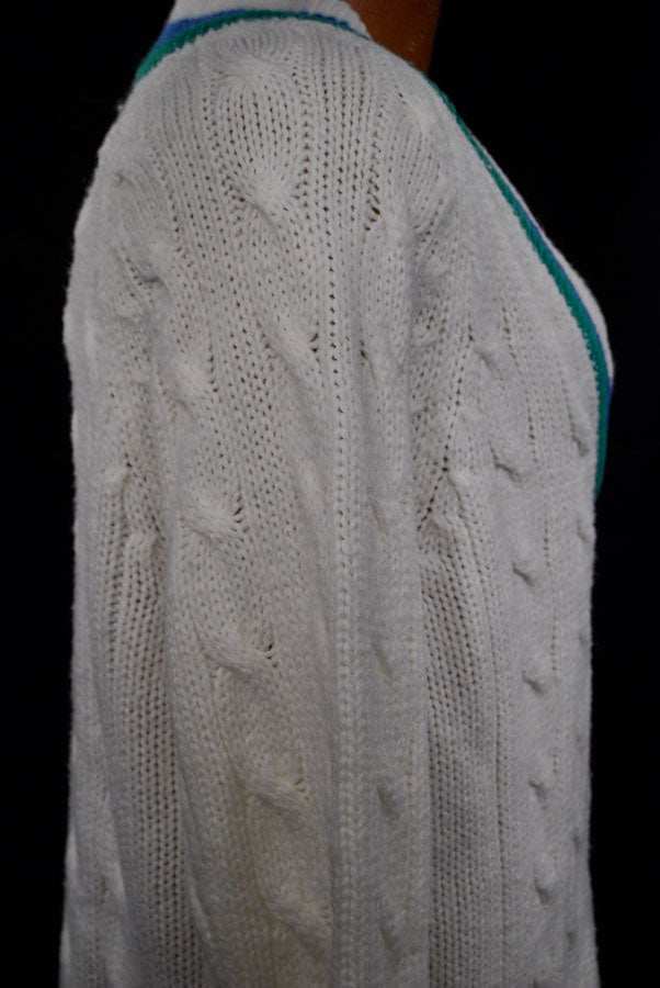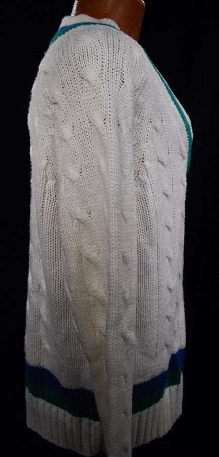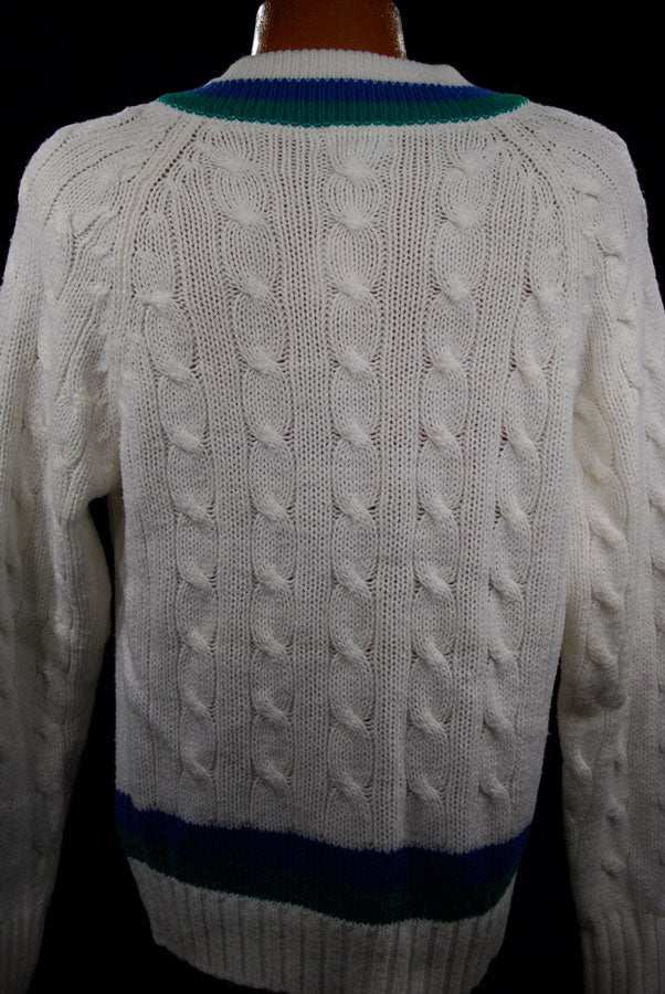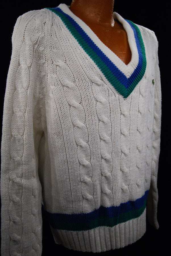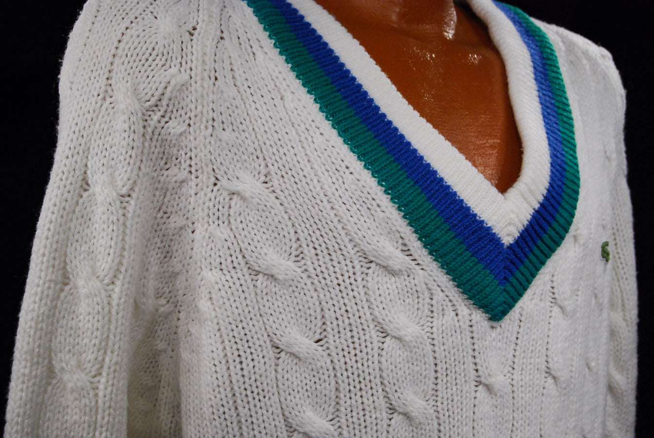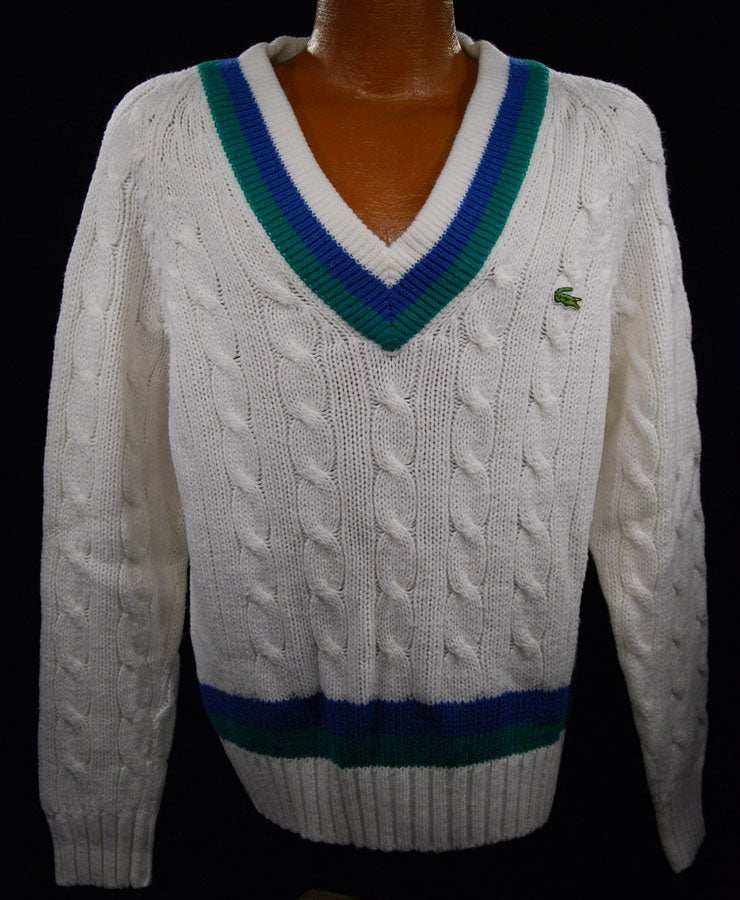 Original Izod Lacoste retro crocodile tennis sweaters with adjacent blue/green neckband stripes.