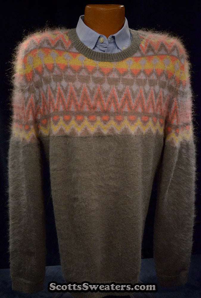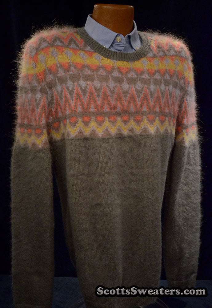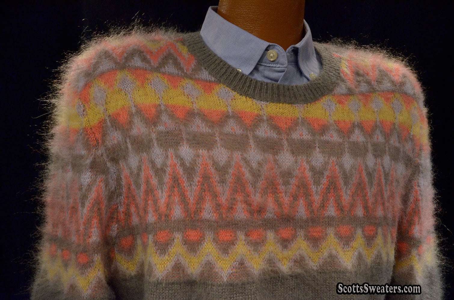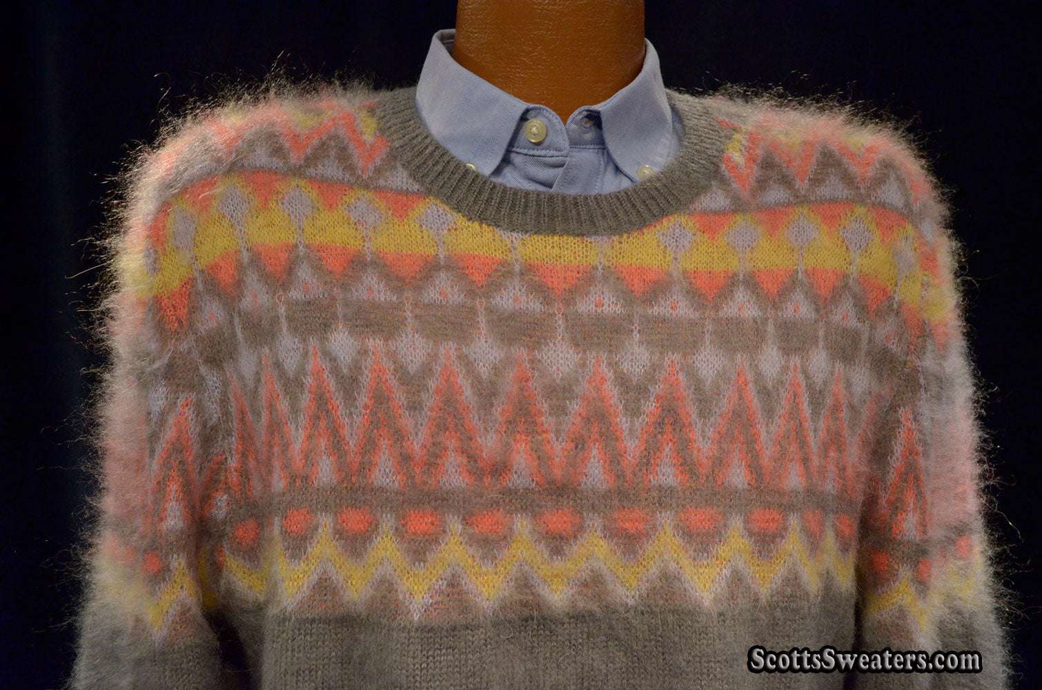 Men's Crewneck mohair sweater with a Fair Isle knitted design in size medium-large (44-46"). This is this only one left in this style.