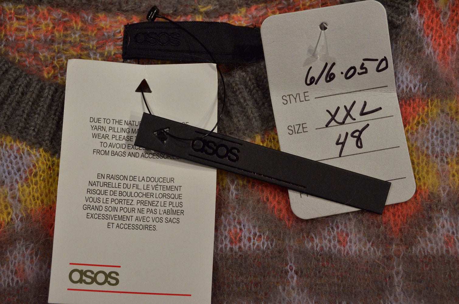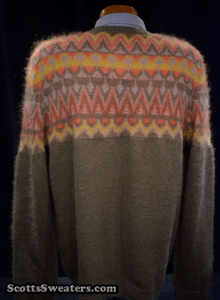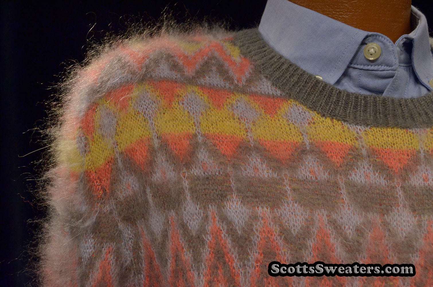 Men's Crewneck mohair sweater with a Fair Isle knitted design in size medium-large (44-46"). This is this only one left in this style.