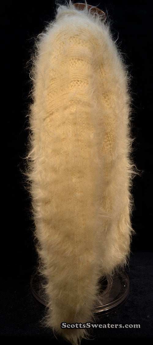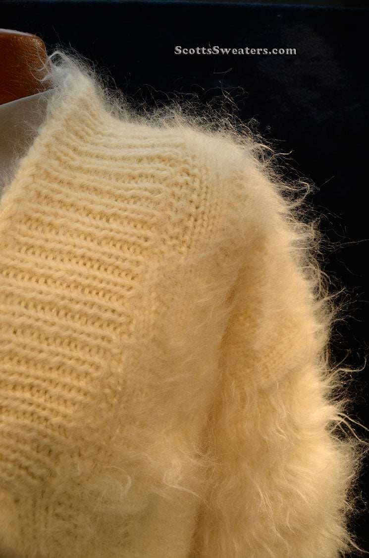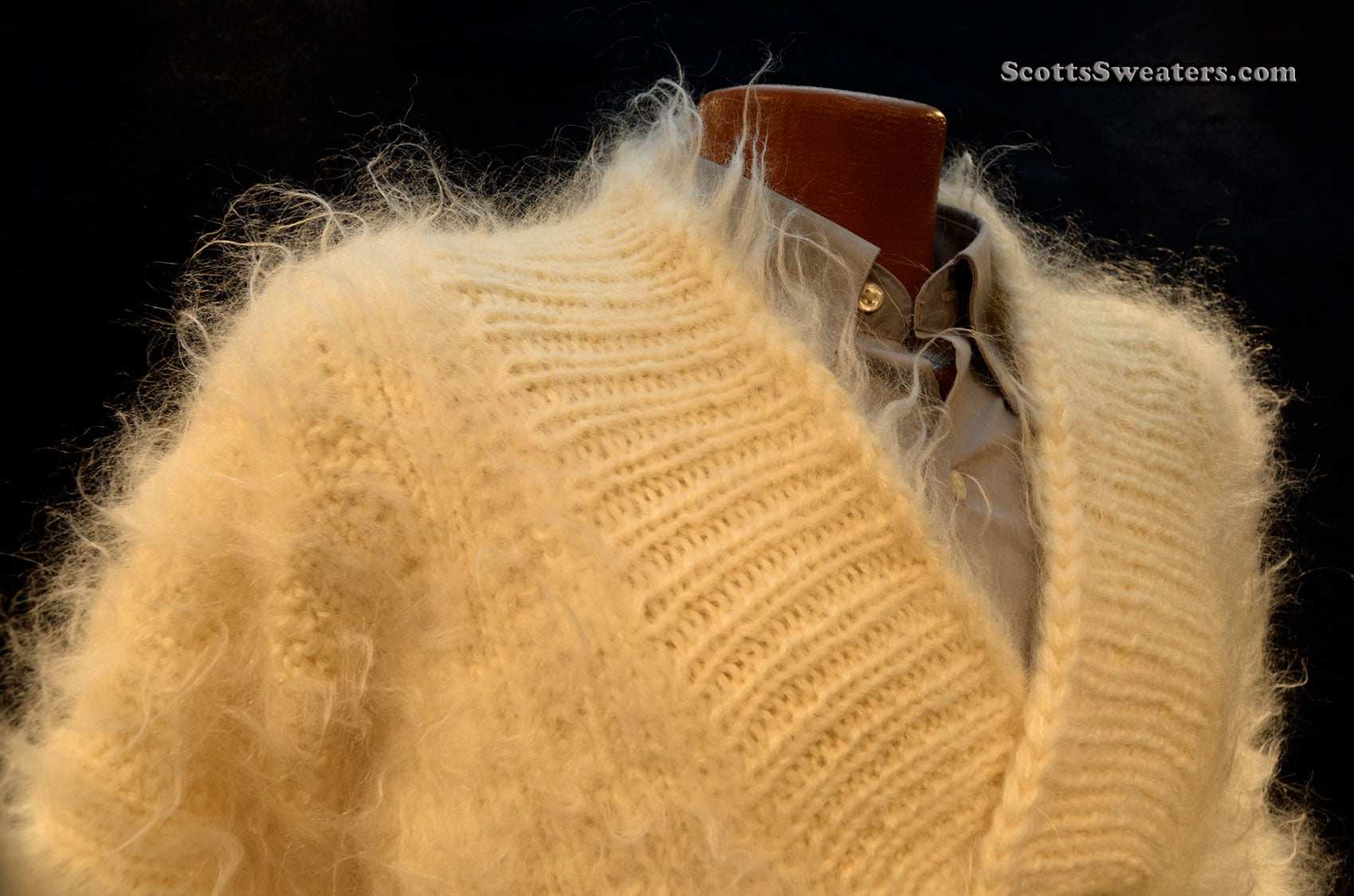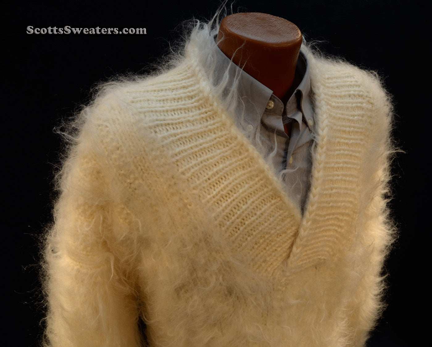 Ivory-white thick, heavy, warm & fuzzy mohair sweater w/shawl-neck by Scott's Sweaters