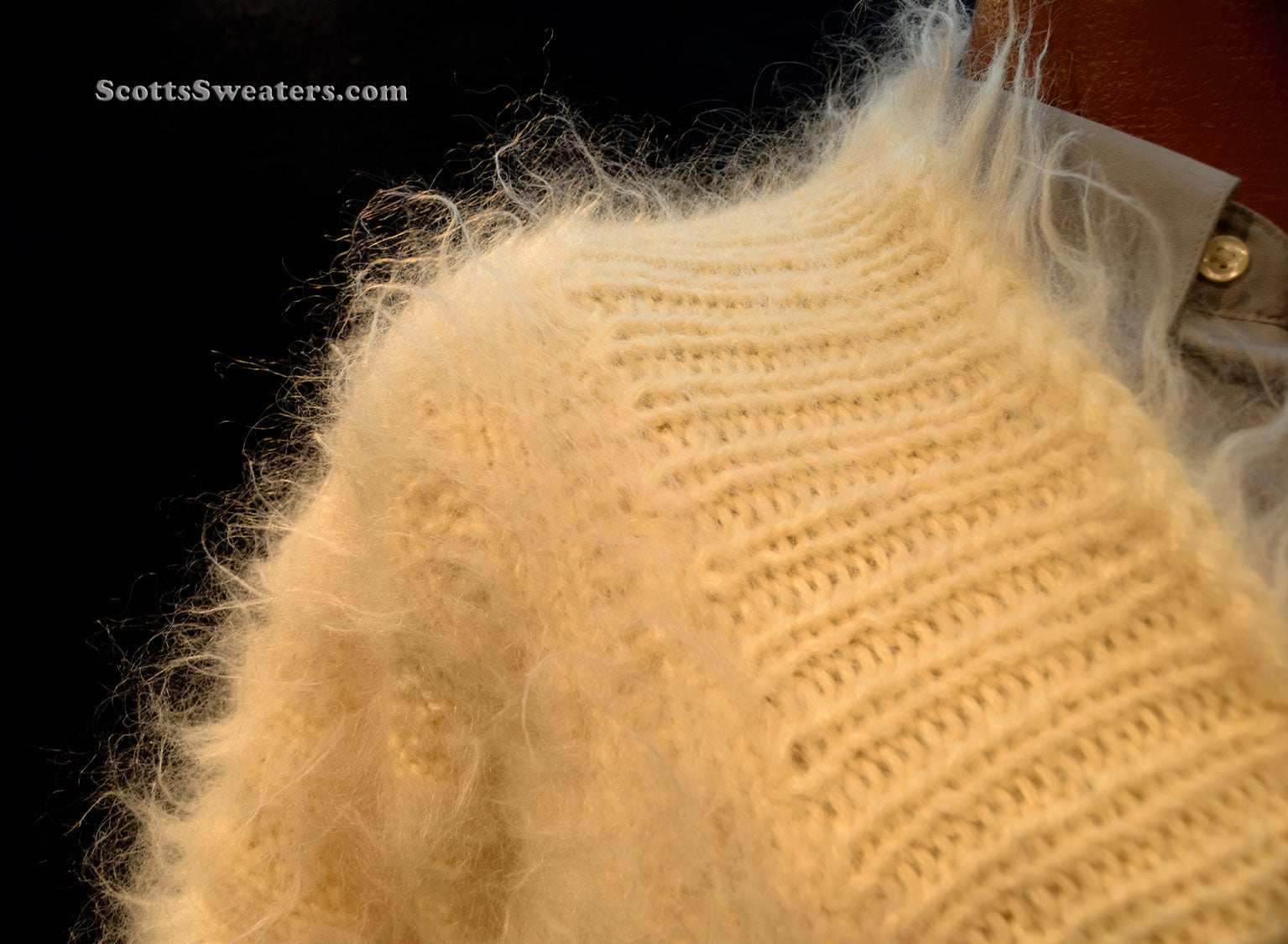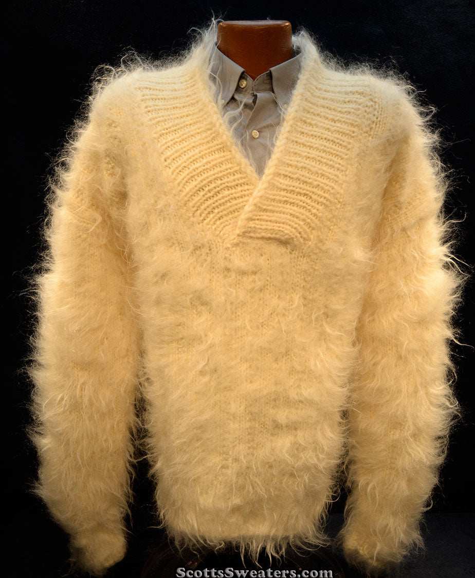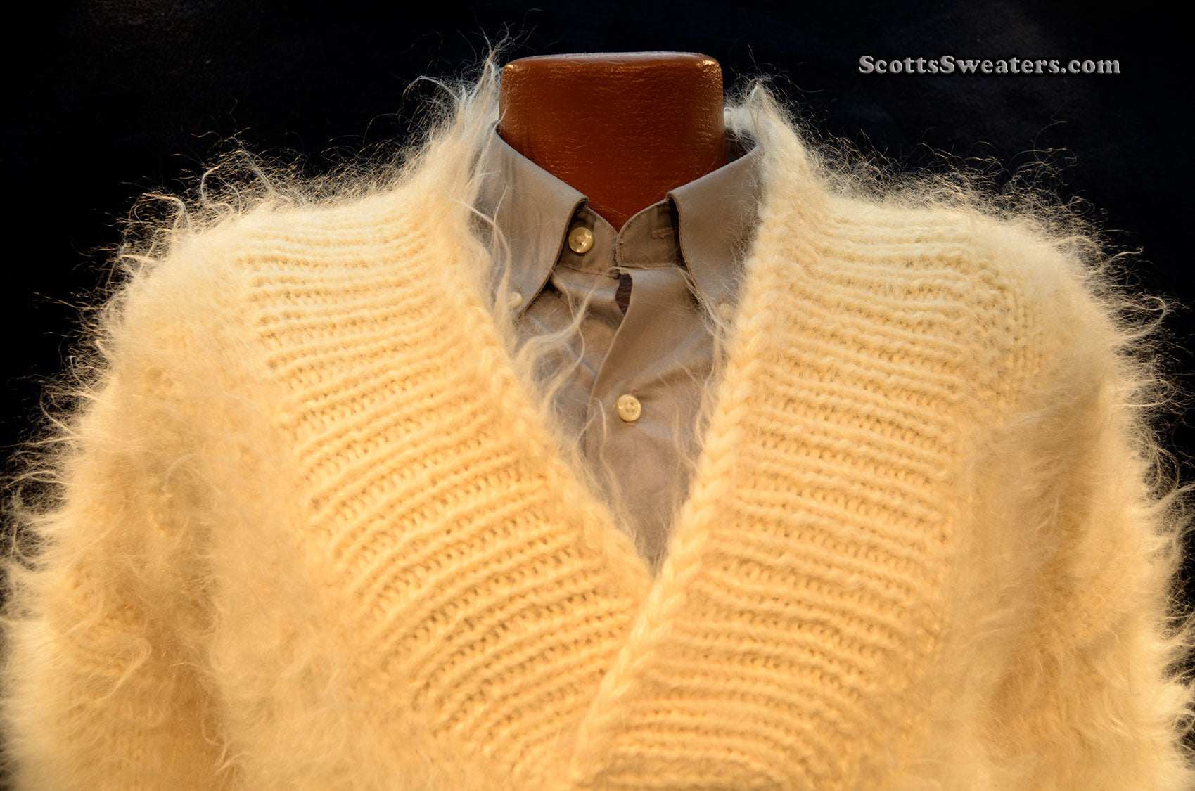 Ivory-white thick, heavy, warm & fuzzy mohair sweater w/shawl-neck by Scott's Sweaters