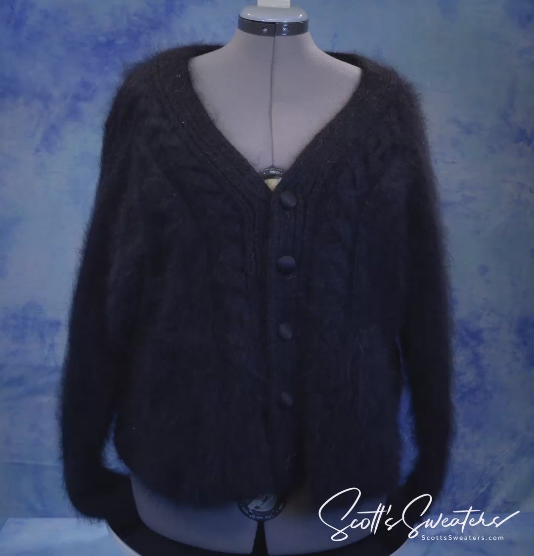 These are men's 100% hand-spun hand-knit angora prototypes sweaters that didn't go into production, that've been discounted for clearance. They're made entirely from the brushed fibers of a knitter's home breed angora rabbits blended with silk that has the feel of fine cashmere.
