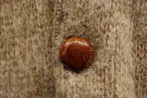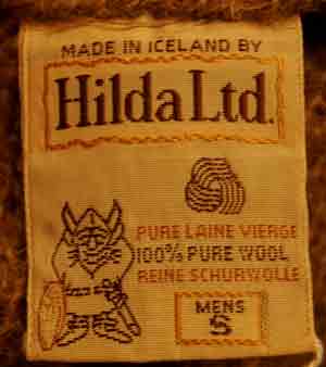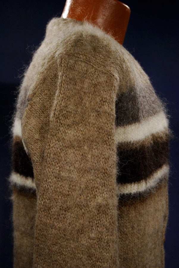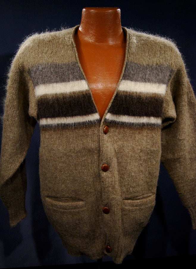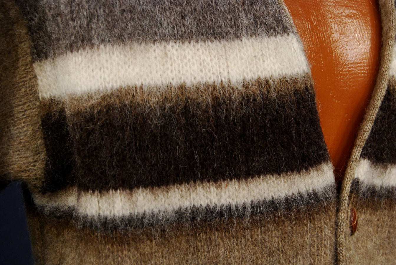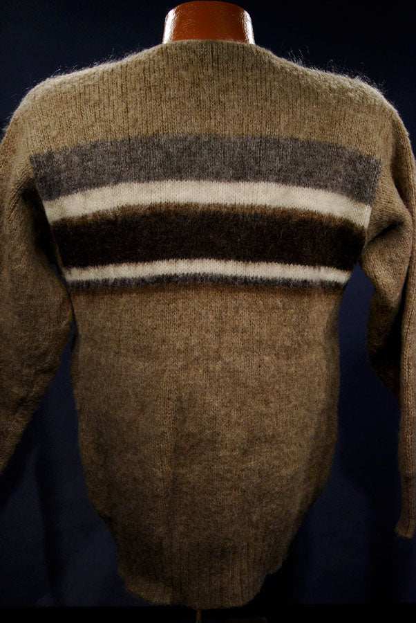 Brown Icelandic wool button-front cardigan with dark brown & white stripes across chest by Hilda Ltd.