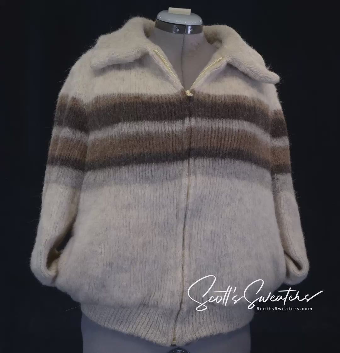 Men's Ivory Icelandic wool jacket with multi-toned grey & brown stripes across chest/sleeves and front pockets by Hilda Ltd,