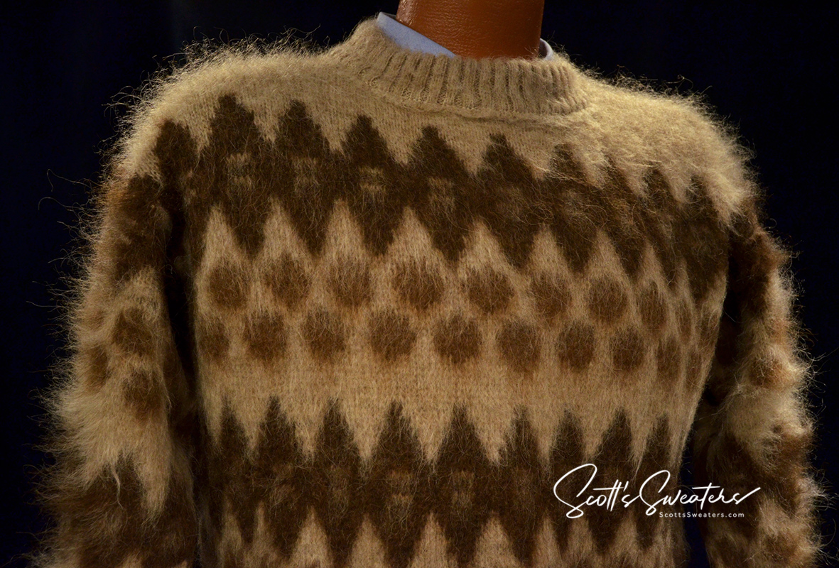 Light-Brown thick & warm fuzzy Icelandic wool crewneck sweater with brown geometric design by Hekla Knitting Mill.