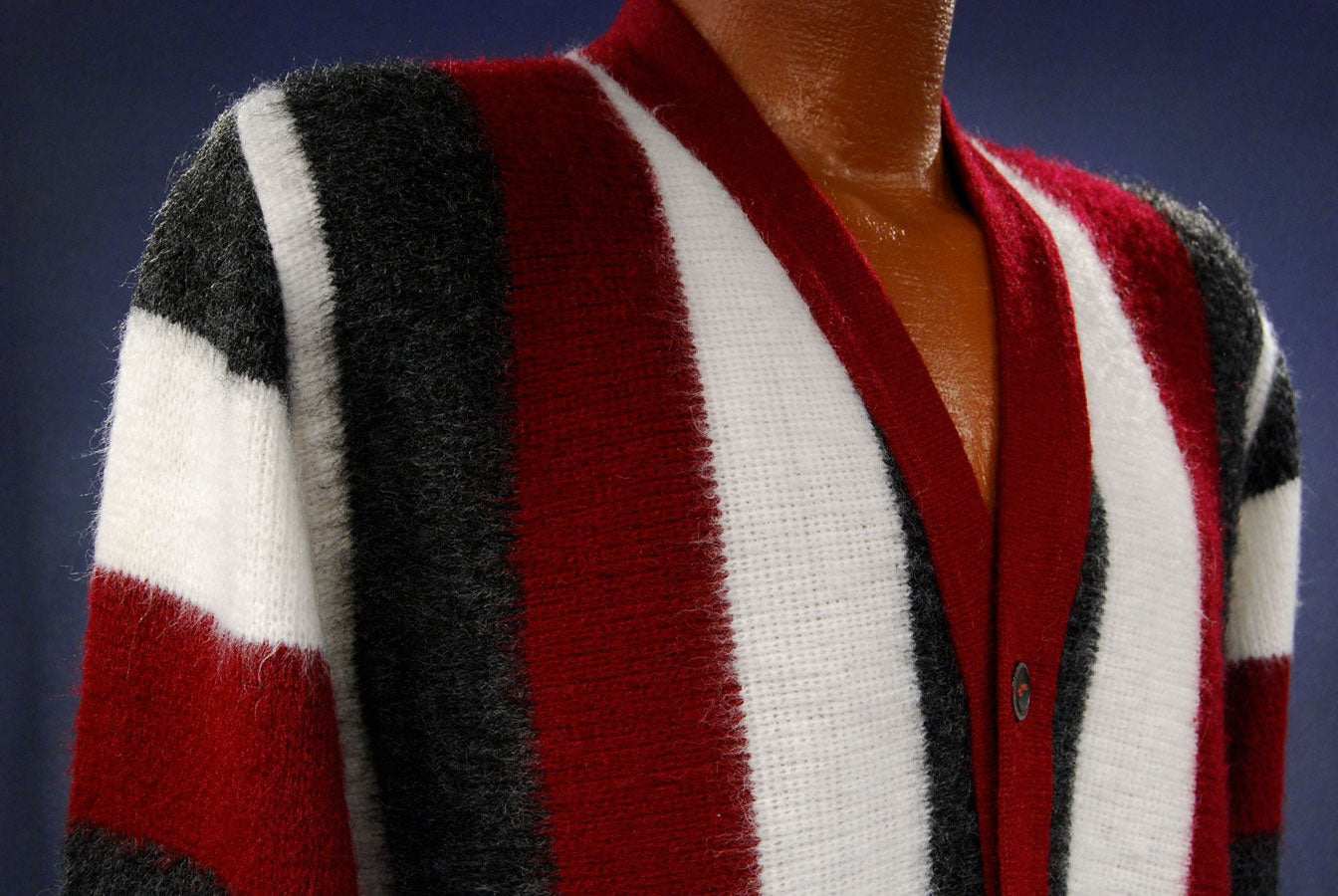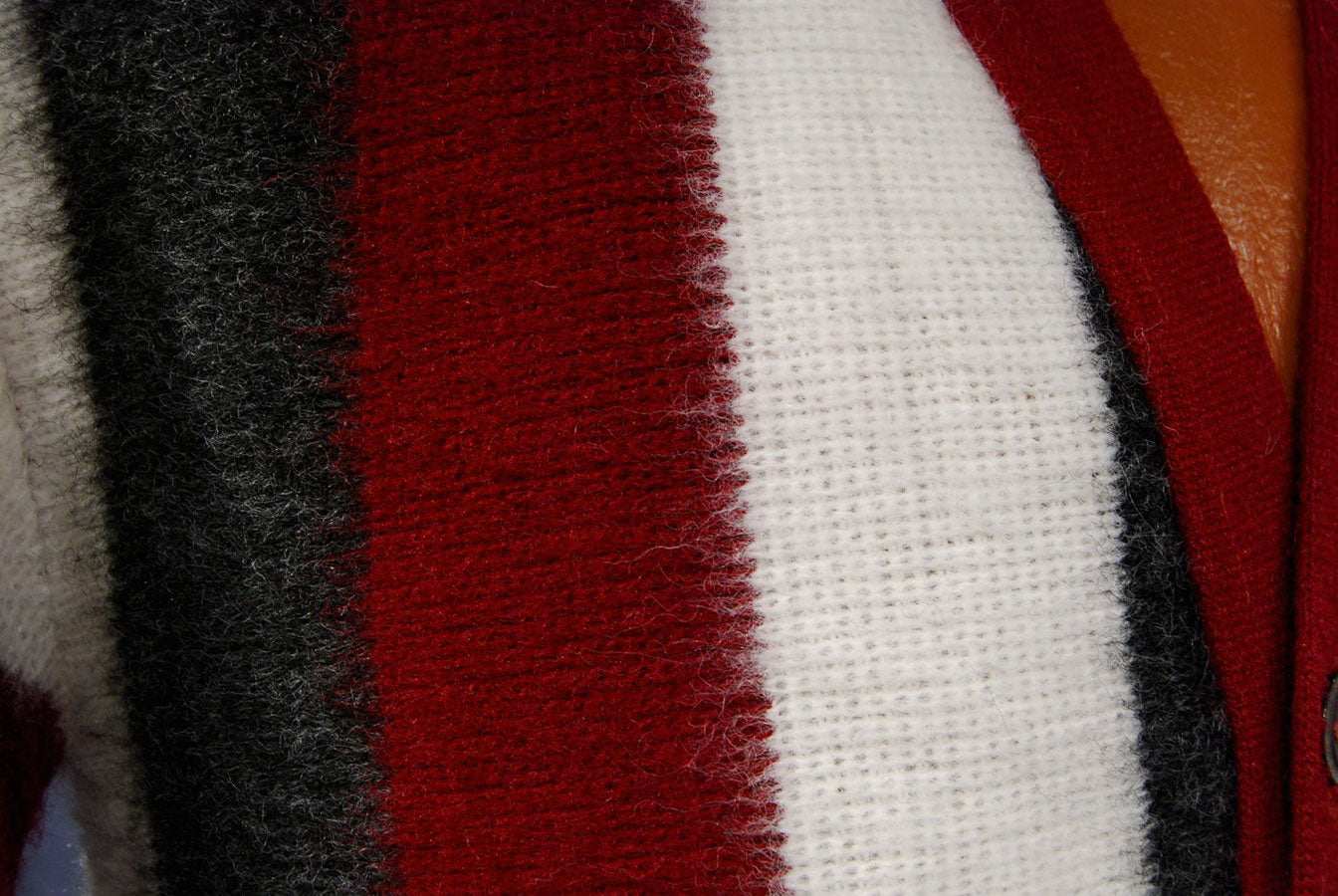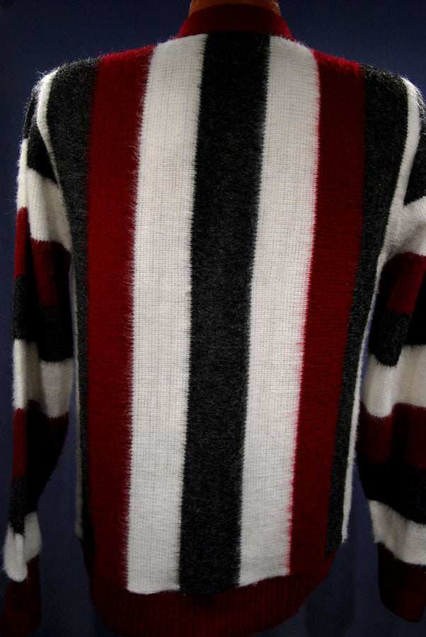Red/White/Grey striped retro brushed acrylic cardigan with faux mohair look by Brent, size Small (40)