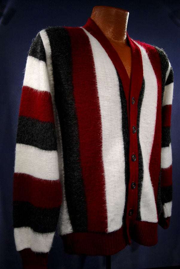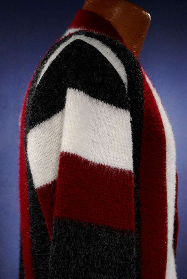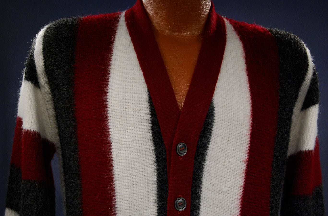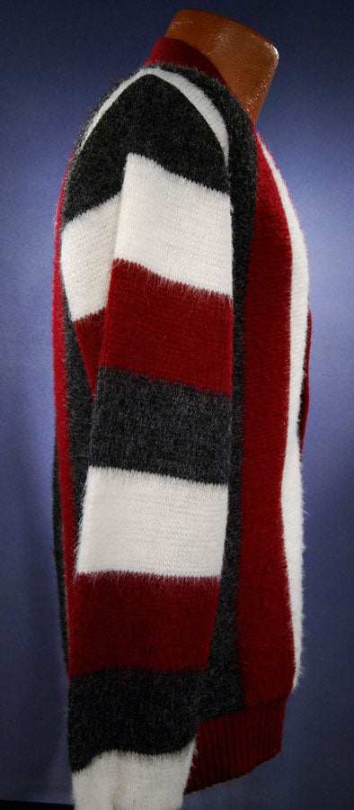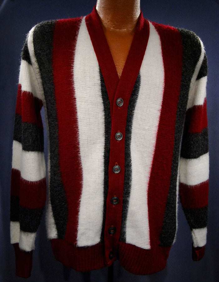Red/White/Grey striped retro brushed acrylic cardigan with faux mohair look by Brent, size Small (40)