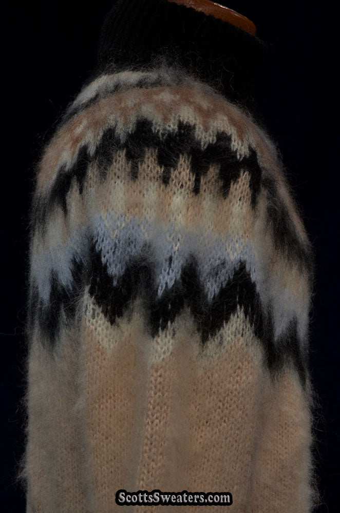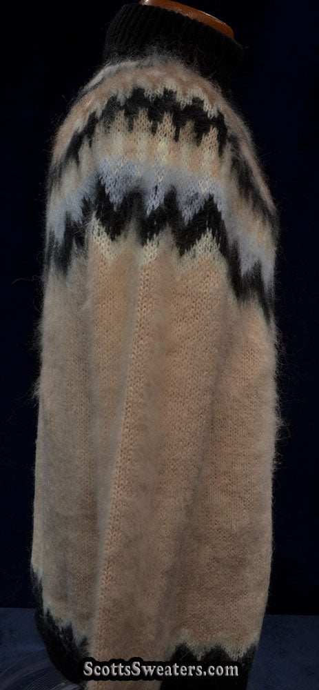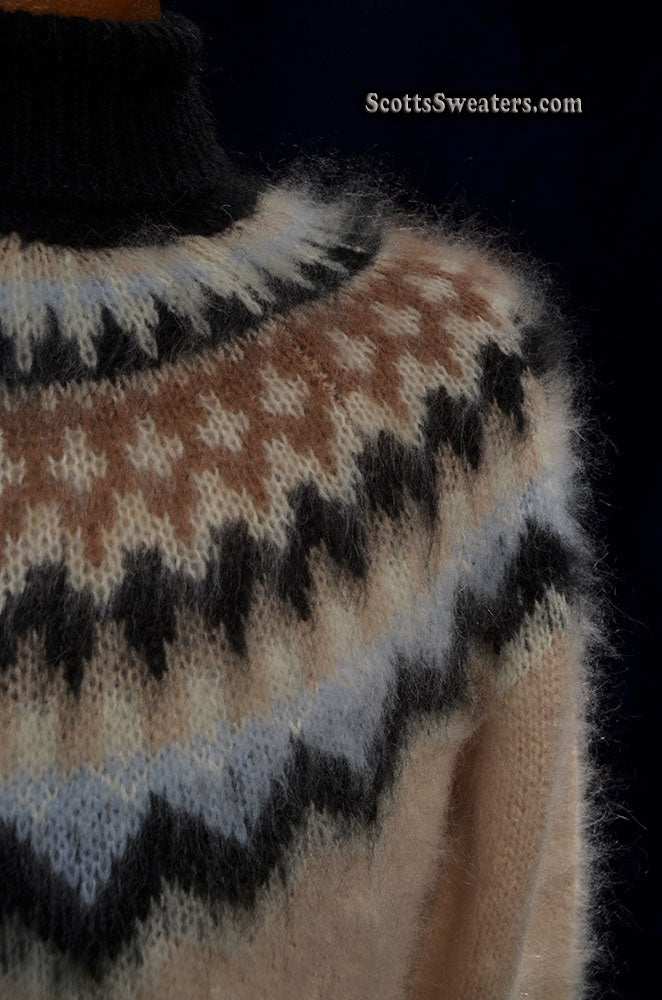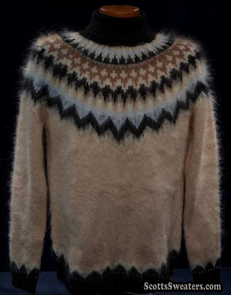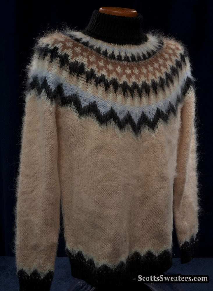 Cream colored new mohair-blend turtleneck sweater with black/tan/white knitted Icelandic yoke design.