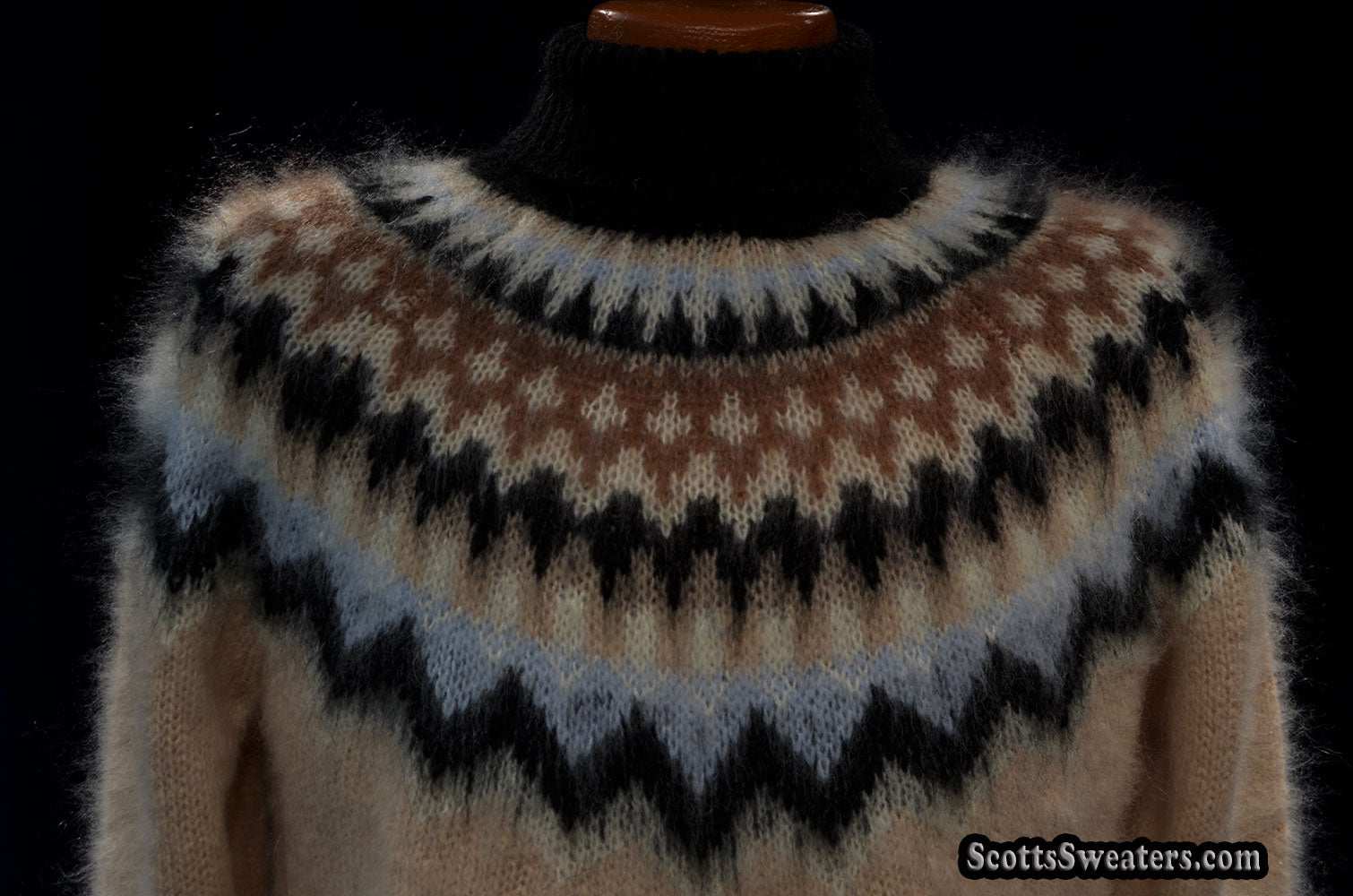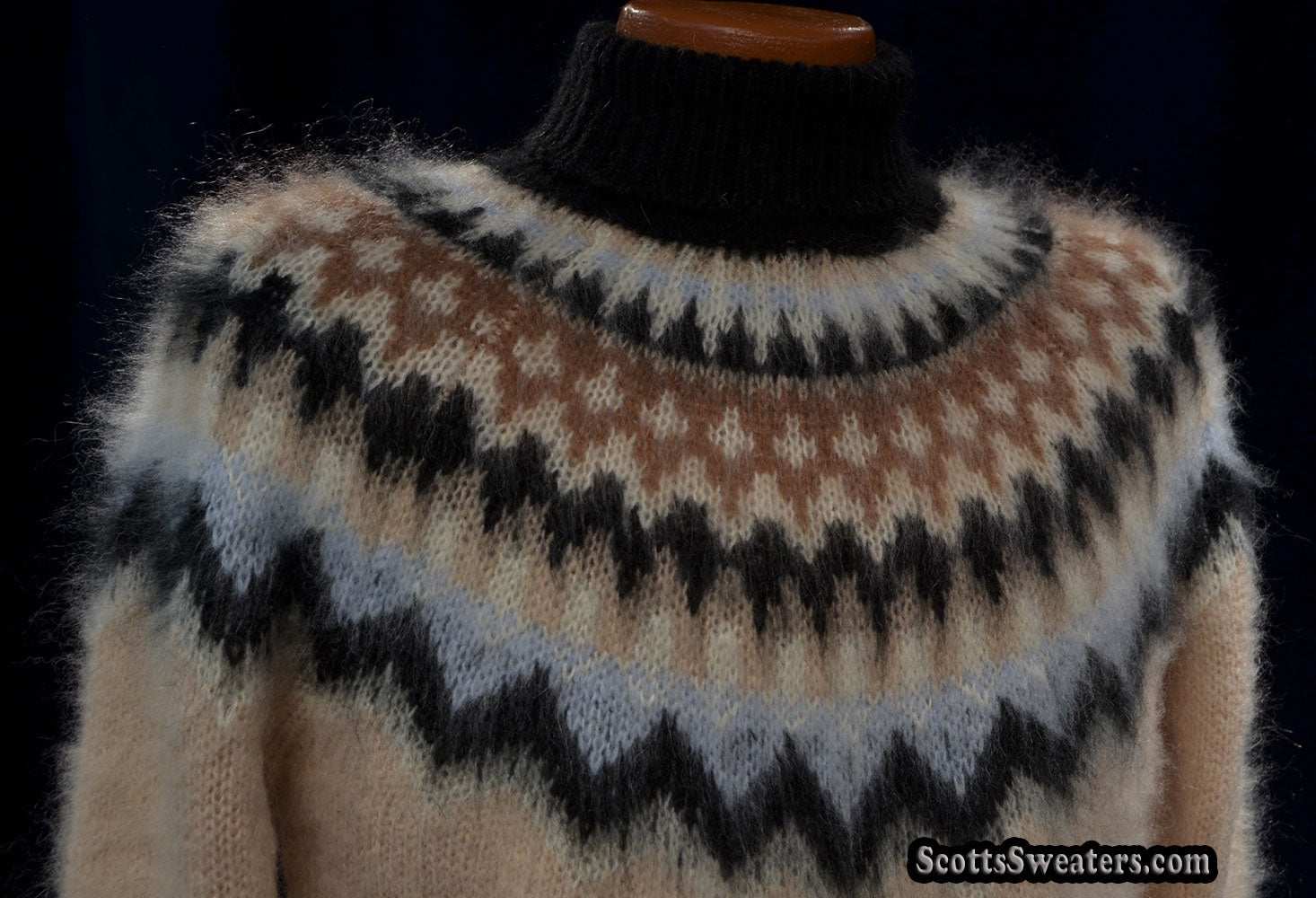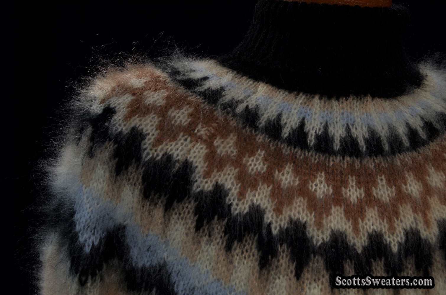 Cream colored new mohair-blend turtleneck sweater with black/tan/white knitted Icelandic yoke design.