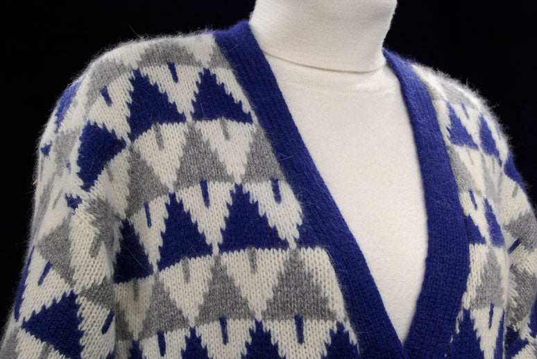 White-grey-blue angora-lambswool Christmas tree cardigan by Geoffrey Alexander for Private Agenda