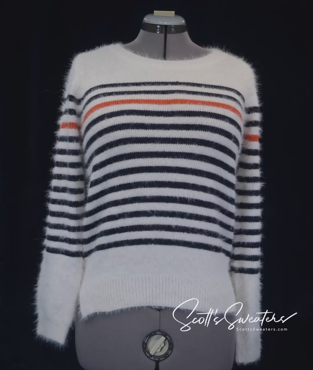 Woman's White fuzzy roundneck pullover sweater with thin horizontal black - and one orange - stripes by Anthropologie Moth