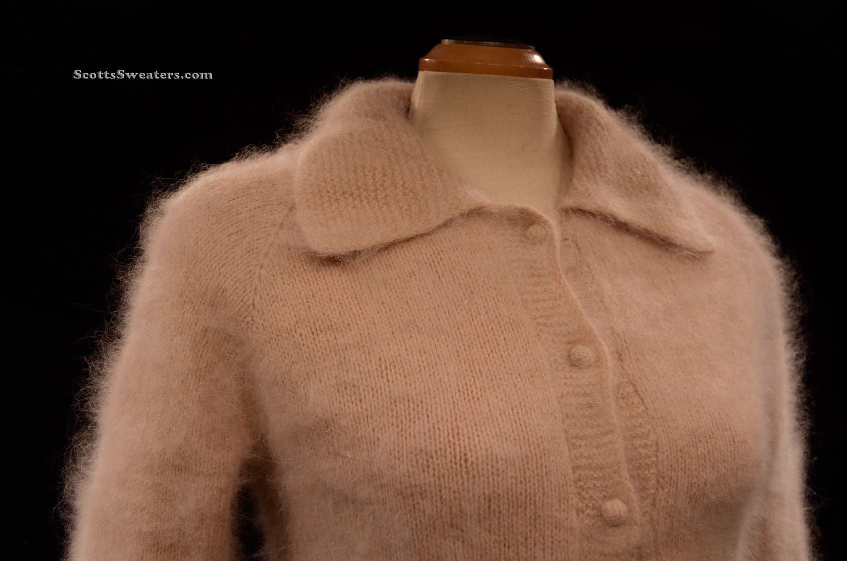 Exquisite taupe colored soft & fuzzy angora sweater-shirt. Nylon lining. This sweater has a luxurious cloud-like softness to it.