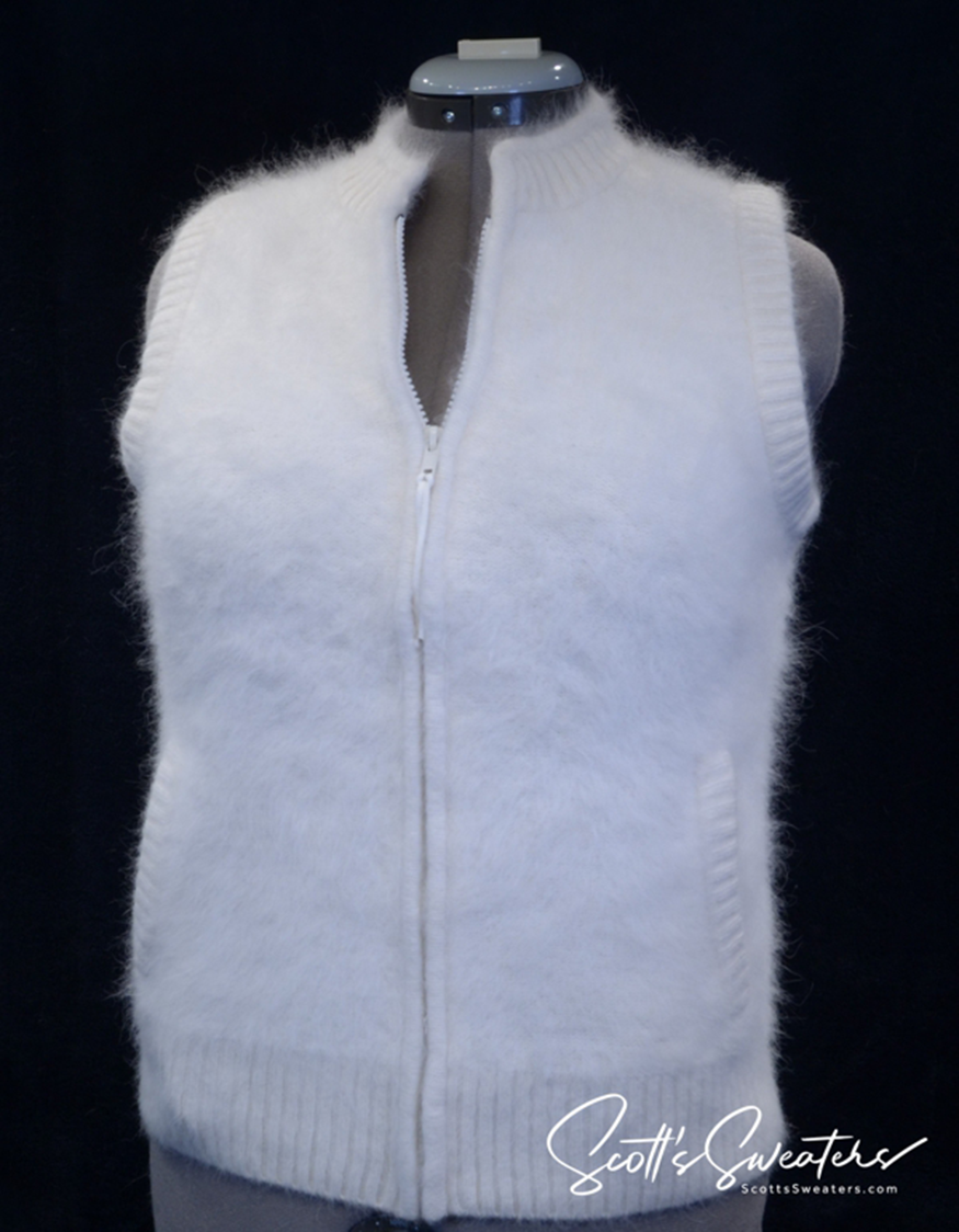 Woman's new 80% angora white zipper-front sweater-vest with slash pockets by Connie A. Lee. Choose from sizes "small-medium" or "medium-large."