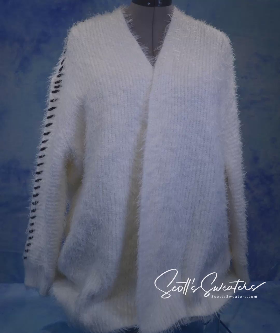 Woman's White Eyelash Cardigan Sweaters with Black Hash Marks Along Sleeves